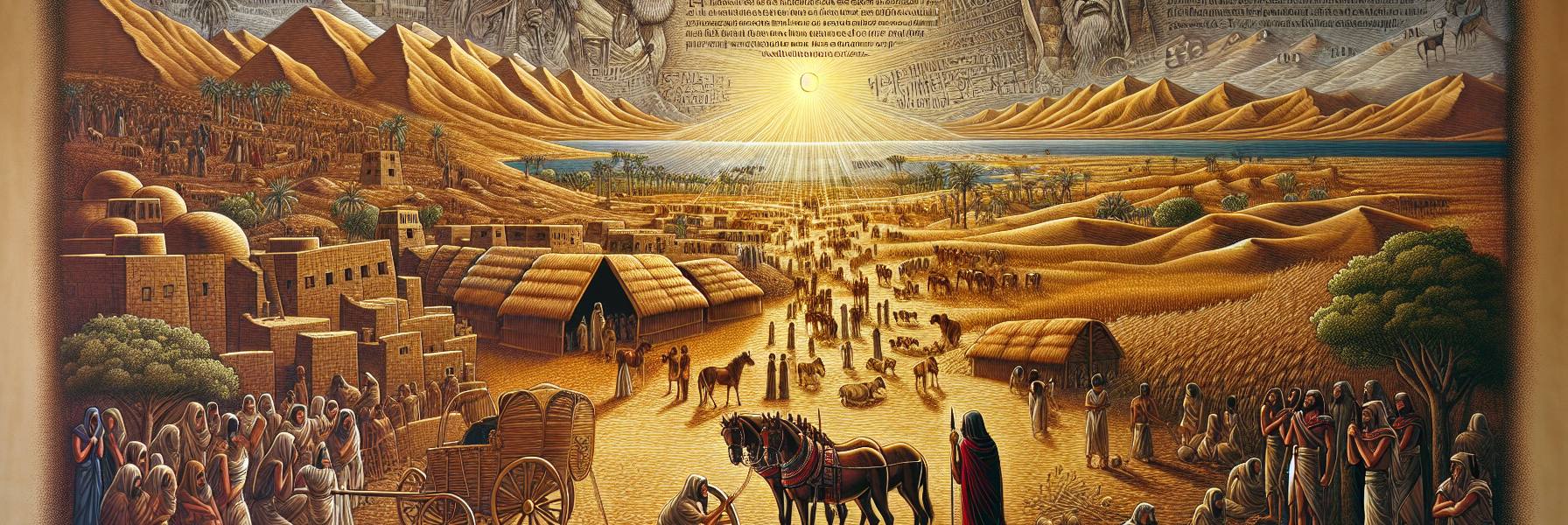 أما يعقوب، فقد جاء إلى مصر ومعه كل عائلته، وأقاموا في أرض جوشن، حيث منحهم يوسف أفضل الحقول والمروج لرعاية مواشيهم. وكان يعقوب قد بلغ من العمر عتياً، فكان يسير ببطء، متكئاً على عصاه، لكن عينيه كانتا تلمعان بالحكمة والامتنان. وعندما وقف أمام فرعون، رفع الملك صوته وسأله: **”كَمْ هِيَ سِنُوكَ؟”** فأجاب يعقوب بصوته الهادئ العميق: **”أَيَّامُ سِنِي غُرْبَتِي مِئَةٌ وَثَلَاثُونَ سَنَةً. قَلِيلَةً وَرَدِيئَةً كَانَتْ أَيَّامُ حَيَاتِي، وَلَمْ تَبْلُغْ أَيَّامَ سِنِي آبَائِي فِي أَيَّامِ غُرْبَتِهِمْ.”** ثم بارك يعقوب فرعون وانصرف من أمامه.