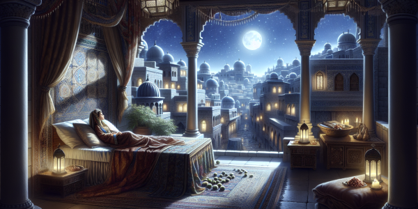 **قصة من سفر نشيد الأنشاد: الأصحاح الخامس** في هدوء الليل، حين كانت النجوم تلمع كالجواهر في عباءة السماء الزرقاء، والنسيم العليل يهمس بأغانيه بين أغصان الأشجار، استيقظت العروس على صوت حبيبها يطرق بابها. كان صوتاً حلواً كالموسيقى، يملأ قلبها شوقاً…