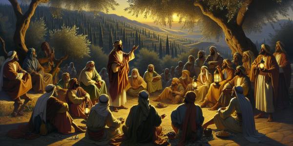 في تلك الأيام المقدسة، وقف يسوع على منحدر جبل الزيتون، محاطاً بتلاميذه الذين التفتوا حوله كالنحل حول خليته. كانت الشمس تميل نحو الغروب، تاركةً خلفها ألواناً أرجوانية وذهبية تزين سماء أورشليم. تنهد الرب تنهيدة عميقة تملأها الحكمة الإلهية، ثم بدأ…
