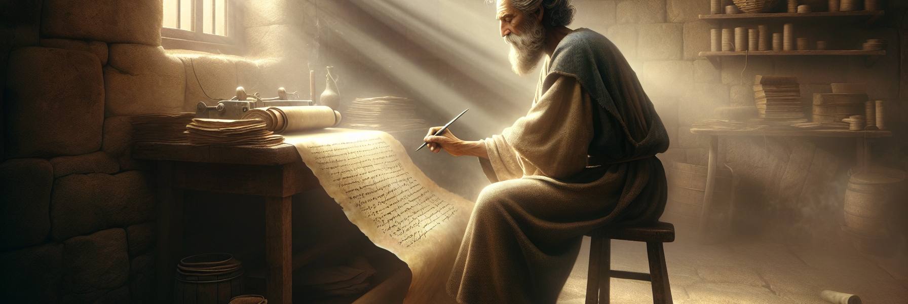 كان سمعان بطرس، الشيخ، جالسًا في غرفته الضيقة في روما. نافذة صغيرة تسمح بدخول ذراع من نور شمس الظهيرة، يلامس الغبار الذي يرقص في الهواء، ويسقط على الرقيم الجلدي الممتد بين يديه. كان الهواء ثقيلًا، حاملاً رائحة الحبر والجلد القديم والمياه الآسنة من النهر البعيد. لم تكن الكتابة سهلة. الألم في عظامه، ذكرى الصلب المقلوب الذي ينتظره، كل ذلك جعل القبضة على القلم أكثر إحكامًا. لكن في قلبه كان هناك طمأنينة أخرى، نار هادئة لا تنطفئ.