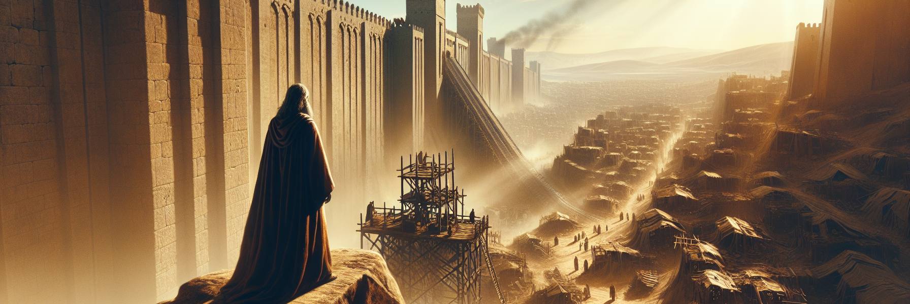 كان اليوم التاسع من الشهر الرابع، وكان الحر ثقيلاً على أورشليم. لقد دام الحصار ثمانية عشر شهراً، والآن صار الجوع ضيفاً في كل بيت، وصارت أحجار السور أشد هزالاً من عظام الأطفال. كانت روائح اليأس تفوح من الأزقة: رائحة الخوف الجاف، ورائحة التراب المحروق، ورائحة الصمت الثقيل الذي يسبق العاصفة.