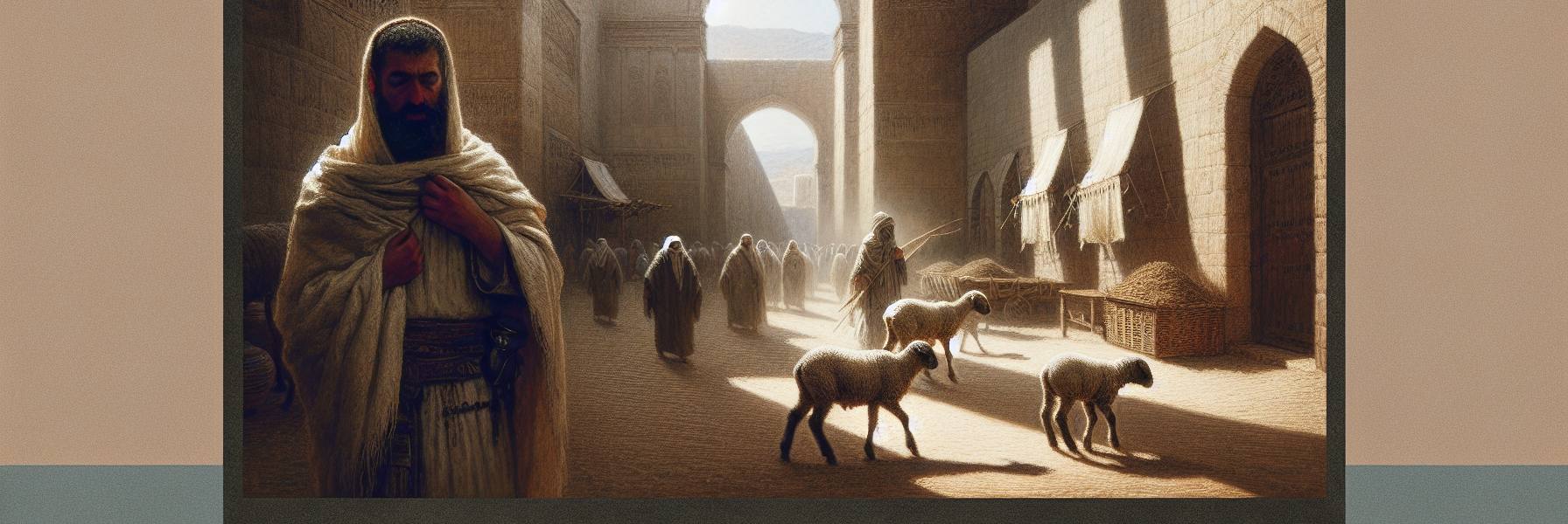 اقترب من الكاهن العجوز، أليعازر، الذي كانت عيناه عميقتين كبئر في صحراء. “جئت، يا سيدي، أريد أن أقرّب قرباناً محرقة… كما أمر الربّ.” صوت أليشاف كان خافتاً، مشوباً بتردد. نظر إليه أليعازر نظرة طويلة، ثم أومأ برأسه ببطء، ليس كمن يؤدّي طقساً، بل كمن يفهم تماماً ما في القلب الذي يقف أمامه. “اختر من البقر أو من الغنم أو من الطير، ما تيسّر لك، ولكن ليكن ذكراً بلا عيب. الأمر ليس في ثمن الحيوان، يا ابني، بل في ما تمثله النفقة من قلبك.”