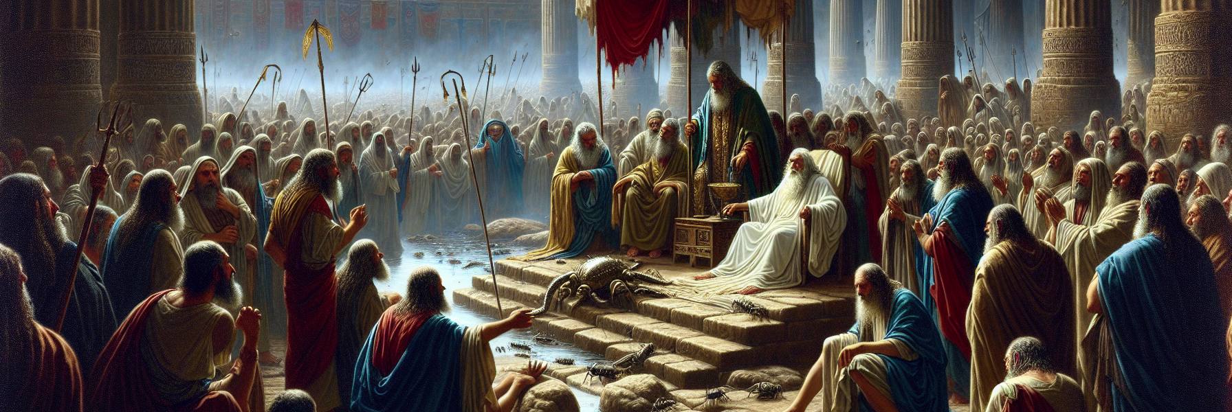 في الساحة الخارجية للقصر، حيث تنتشر تماثيل أبيس الآلهة وتحرسها أبو الهول الصامتة، وقفا أمام فرعون. لم يكن الفرعون جالساً على عرشه من حجر الديوريت ذلك اليوم، بل كان واقفاً، محاطاً بمستشاريه وكهنته، وكأنه استعد للمواجهة. “هكذا يقول الرب، إله العبرانيين”، بدأ موسى وصوته لا يرتجف، بل يملأ الفضاء الهادئ، “أطلق شعبي ليعبدوني”. كانت العبارة نفسها تتردد كصدى، ولكن الجو كان مشحوناً بذكريات الدم والنار والضفادع والذُباب.