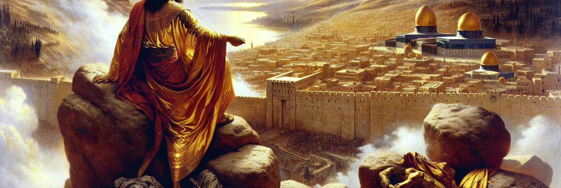 كان اليوم يُحمَل فوق أورشليم كجوهرةٍ ذائبة في كفِّ الشمس. كان الهواء ثقيلاً برائحة أخشاب الأرز القادمة من مخازن المدينة، وتراب الطرق المُحَطَّم تحت أقدام الجياد والعربات. وفي قلْب هذا الحرّ، وقف سليمان في ساحة القصر، نظراته تتجاوز الأسوار المشيّدة حديثاً نحو التلّ الشمالي. كان مكاناً عارياً، لكنه في عيني الملك، كان يحمل هيكلاً لم يُرَ مثله.