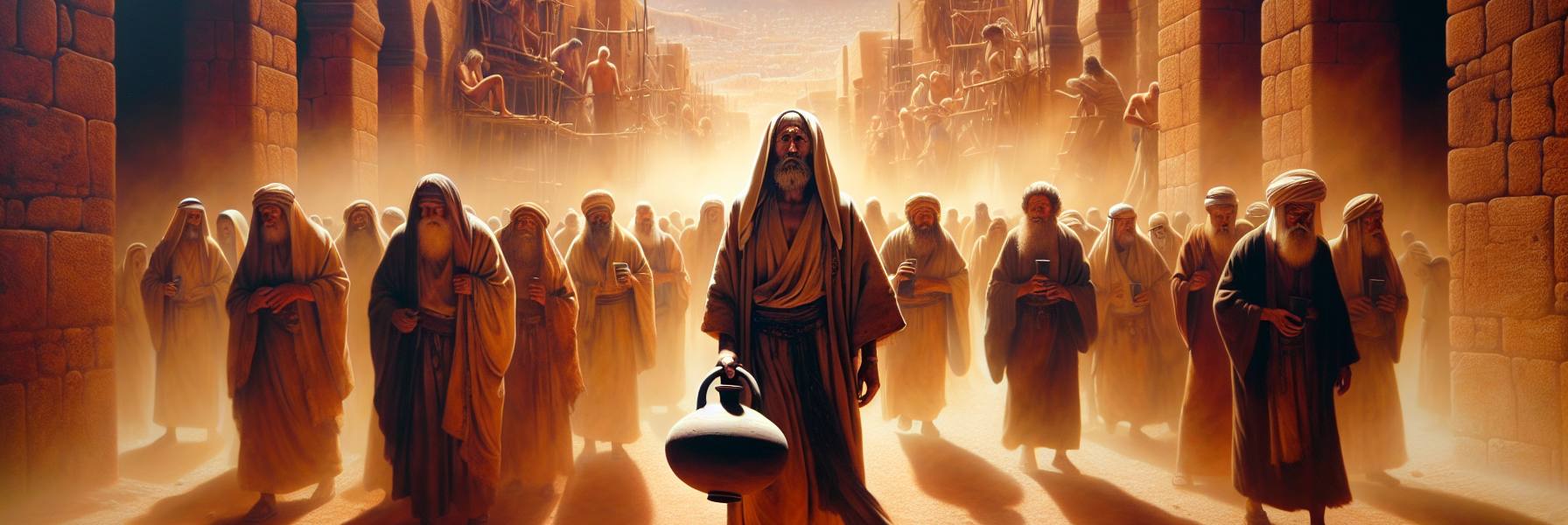 ثم رفع الجرّة الفخّار بين يديه، ونظر إليها نظرة وداع. في تلك اللحظة، لم تكن جرّة، بل كانت أورشليم: جدرانها، هياكلها، قصورها، زوايا أطفالها. كل هذا الجماد والحيّز صار قابلاً للكسر. وأمام الأعين المذهولة، رفعها عالياً وكرّها على الأرض بقوةٍ أتت من أعماق روحه المنهكة.