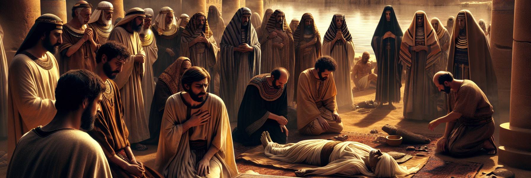 فَسَمِعَ يُوسُفُ هَذَا الْكَلَامَ، فَبَكَى. لَمْ يَكُنْ بُكَاؤُهُ خَفِيًّا، بَلْ انْهَالَتِ الدُّمُوعُ عَلَى لِحْيَتِهِ الْفِضِّيَّةِ كَنَهْرٍ صَغِيرٍ. تَذَكَّرَ الْجُبَّ، وَتِجَارَ مِدْيَانَ، وَسِنِينَ السِّجْنِ، وَالْحُلْمَ الْعَظِيمَ الَّذِي تَحَقَّقَ. تَذَكَّرَ وُجُوهَ إِخْوَتِهِ وَهُمْ يَسْتَسْقُونَ فِي أَرْضِ الْجُوعِ، مُنْكَسِرِينَ. فَأَرْسَلَ يَدْعُوهُمْ جَمِيعًا لِحُضُورِهِ.