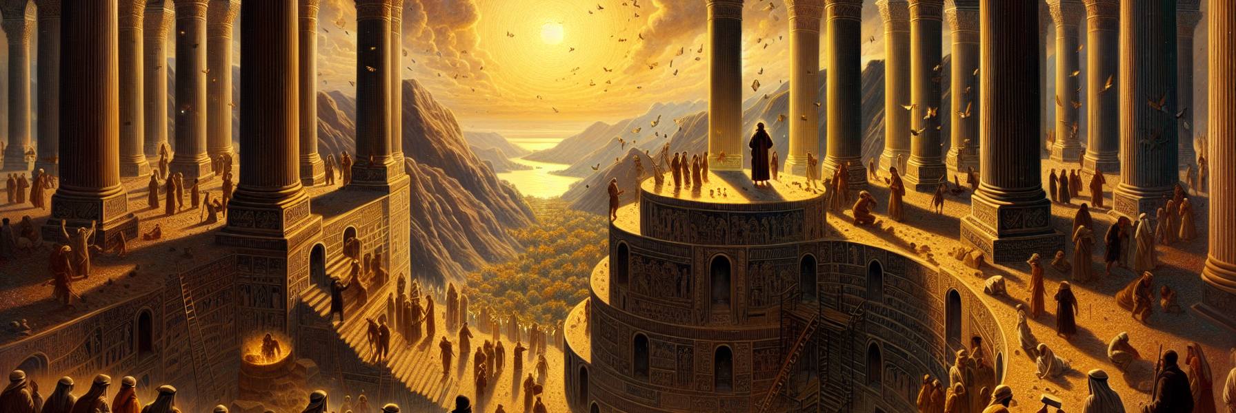 وَظَلَّ الْعَمَلُ يَسِيرُ شَهْرًا تِلْوَ شَهْرٍ. فِي بَعْضِ الْأَيَّامِ، كَانَ سُلَيْمَانُ يَجْلِسُ عَلَى كُرْسِيِّهِ الْمُنْخَفِضِ عَلَى مُرْتَفَعٍ مُقَابِلٍ، يَتَأَمَّلُ فِي صَمْتٍ. رَائِحَةُ الْأَرْزِ وَالذَّهَبِ وَالْحَجَرِ الْجَدِيدِ تَخْتَلِطُ فِي هَوَاءِ الْجَبَلِ. كَانَ يَسْمَعُ صَوْتَ مُهَنْدِسٍ شَيْخٍ يُهَمْهِمُ بِآيَةٍ مِنَ الْمَزَامِيرِ بَيْنَمَا يَقِيسُ زَاوِيَةً بِحَبْلٍ: “إِنْ لَمْ يَبْنِ الرَّبُّ الْبَيْتَ، فَبَاطِلًا يَتْعَبُ الْبُنَاةُ”. كَانَتِ الْكَلِمَاتُ تَتَدَحْرَجُ بَيْنَ الْحُجَرِ، فَتَمْلَأُ الْمَكَانَ بَشَرًا وَطُمَأْنِينَةً.