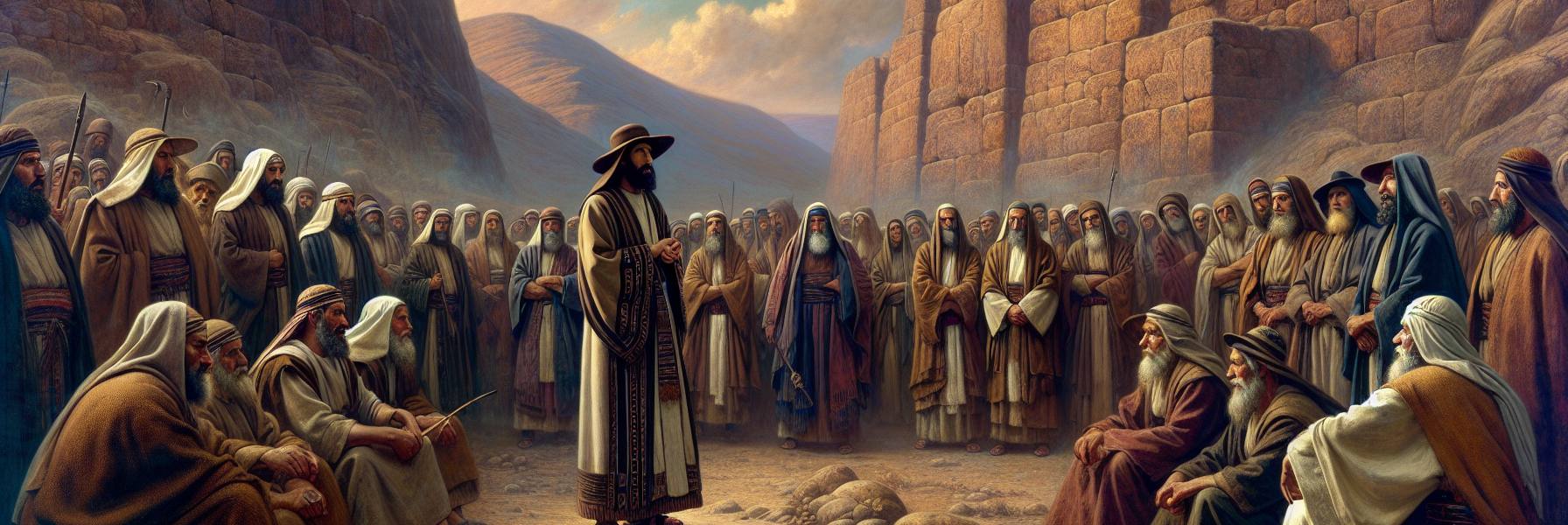كان الجوّ في وادي شكيم ثقيلاً بحرارة الشمس الأخيرة، وكان الغبار الذي تثيره أقدام الجمع الغفير يعلق في الهواء كضباب ذهبي. وقف يشوع بن نون، وقد انحنى ظهره قليلاً تحت ثقل السنوات، لكن عينيه كانتا كجمرتين متقدتين تحت حاجبيه الكثين. اجتمعت حوله وجوه القبائل كلها: شيوخ بشوارب بيضاء طويلة، وشبان بأكتاف عريضة تحمل آثار المعارك، ونساء يسمعن من خلف منازلهن المبنية من حجارة الجبل.